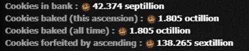ようやく3度目の転生。 今回の周回で焼いたクッキーの数が、 これまでの周回で焼いたクッキーと同じくらいになったら転生するといいという話も聞きますが、ガン無視。 ヘブンリーチップスが5000超えてから転生しました。 転生の基準は、しばらく放置しても何…